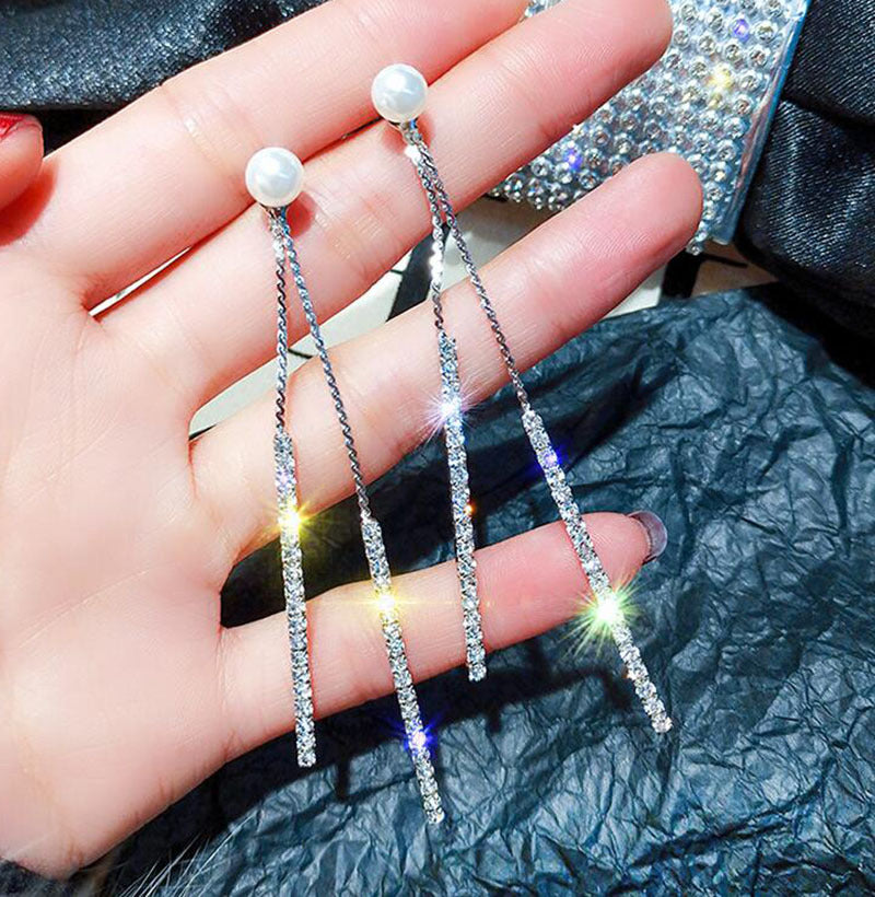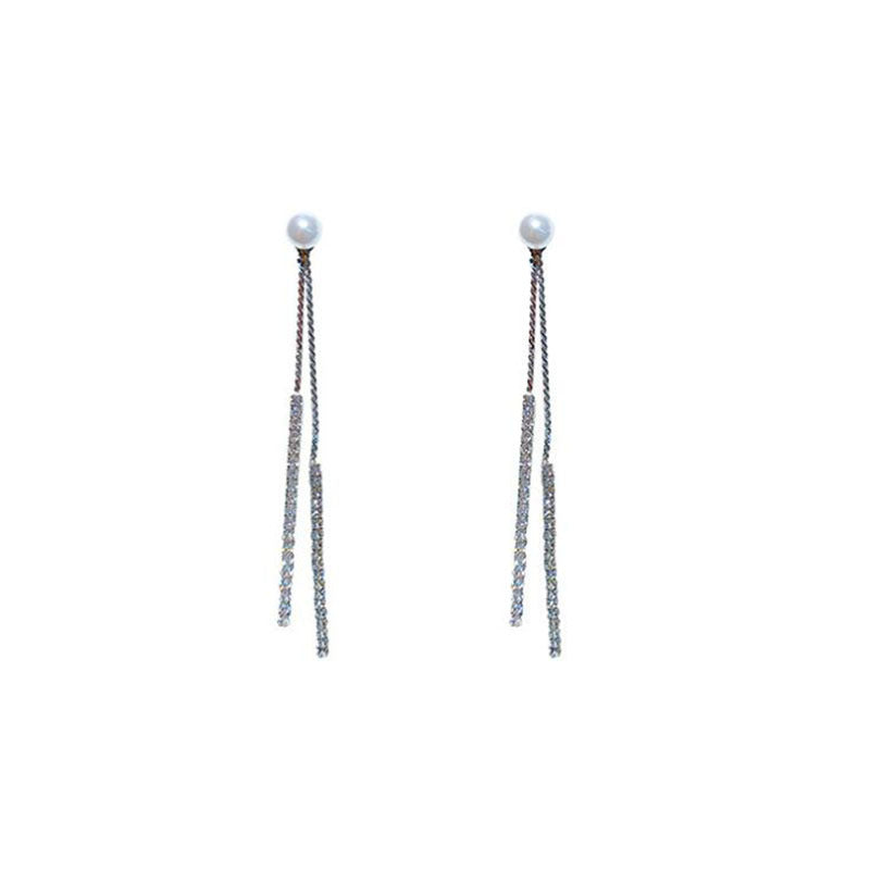 925 Silver Needle Long Tassel A Two-Pearl Stud Earrings