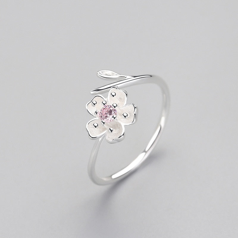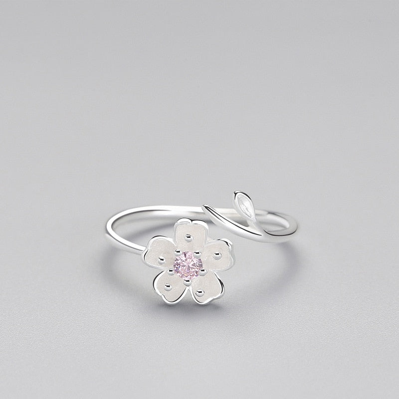 925 Sterling Silver Zircon Enamel Plum Flower Adjustable Ring