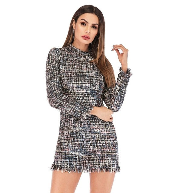 Spring Plaid Print Tassels Mini Dress Women Elegant