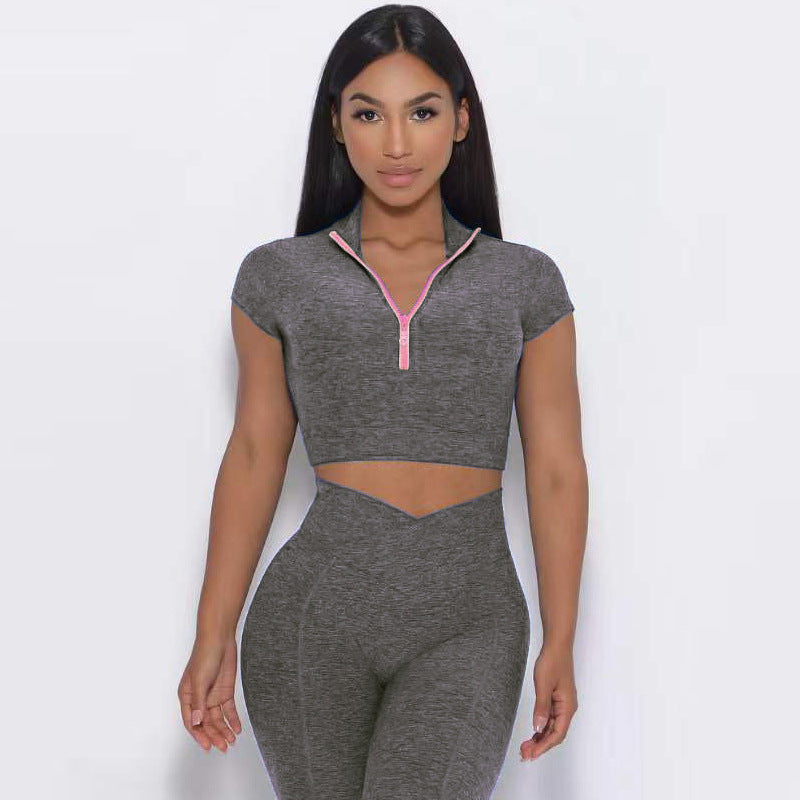 Yoga suit set, single shoulder bra, zipper, short sleeves, hip lifting shorts, long pants, fitness